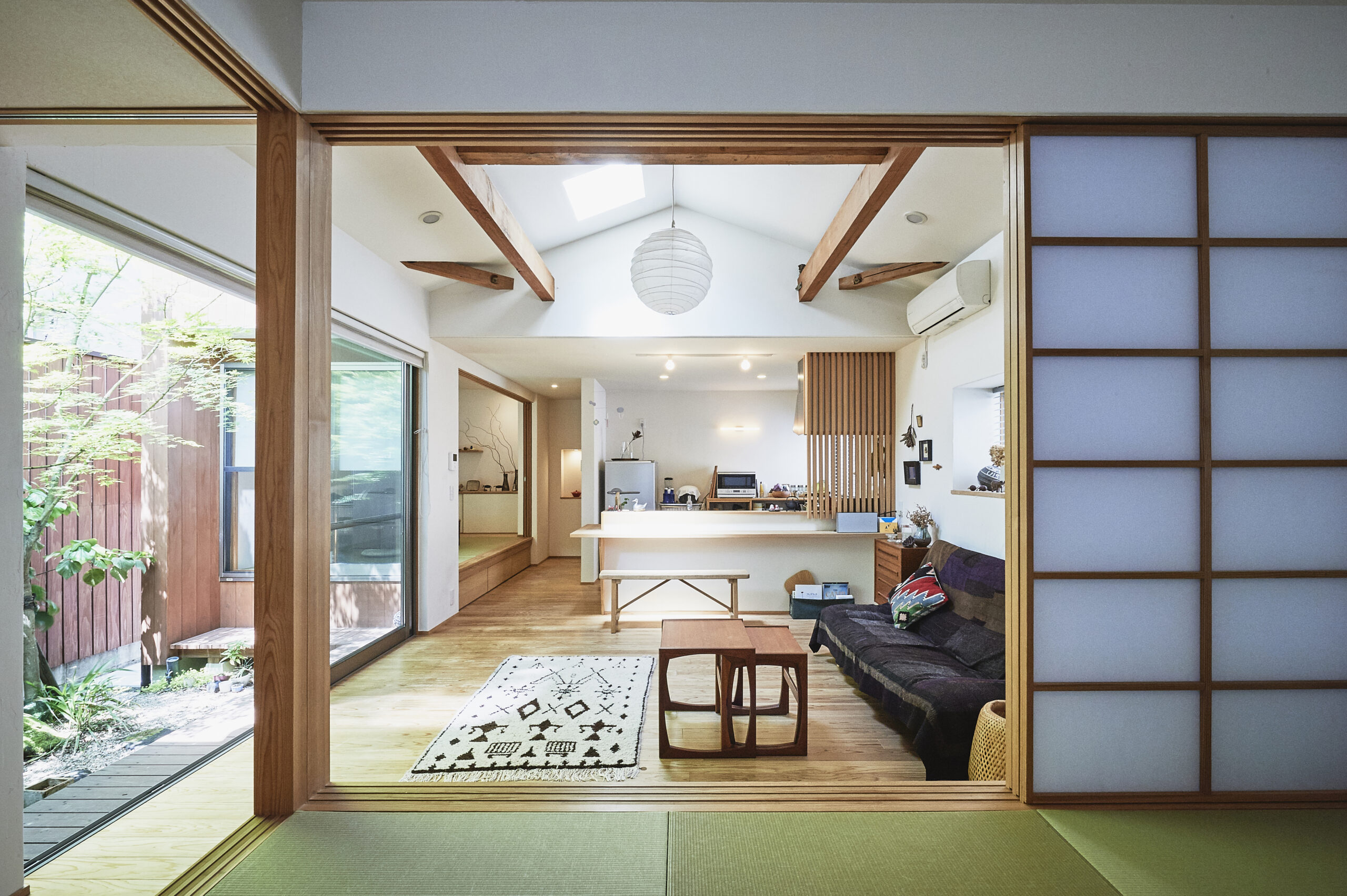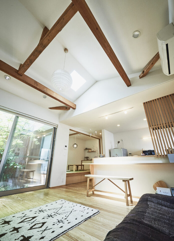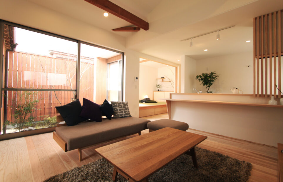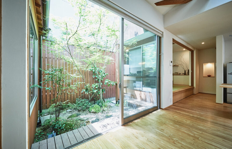 和室とリビングは坪庭を囲み、光と季節を映す。