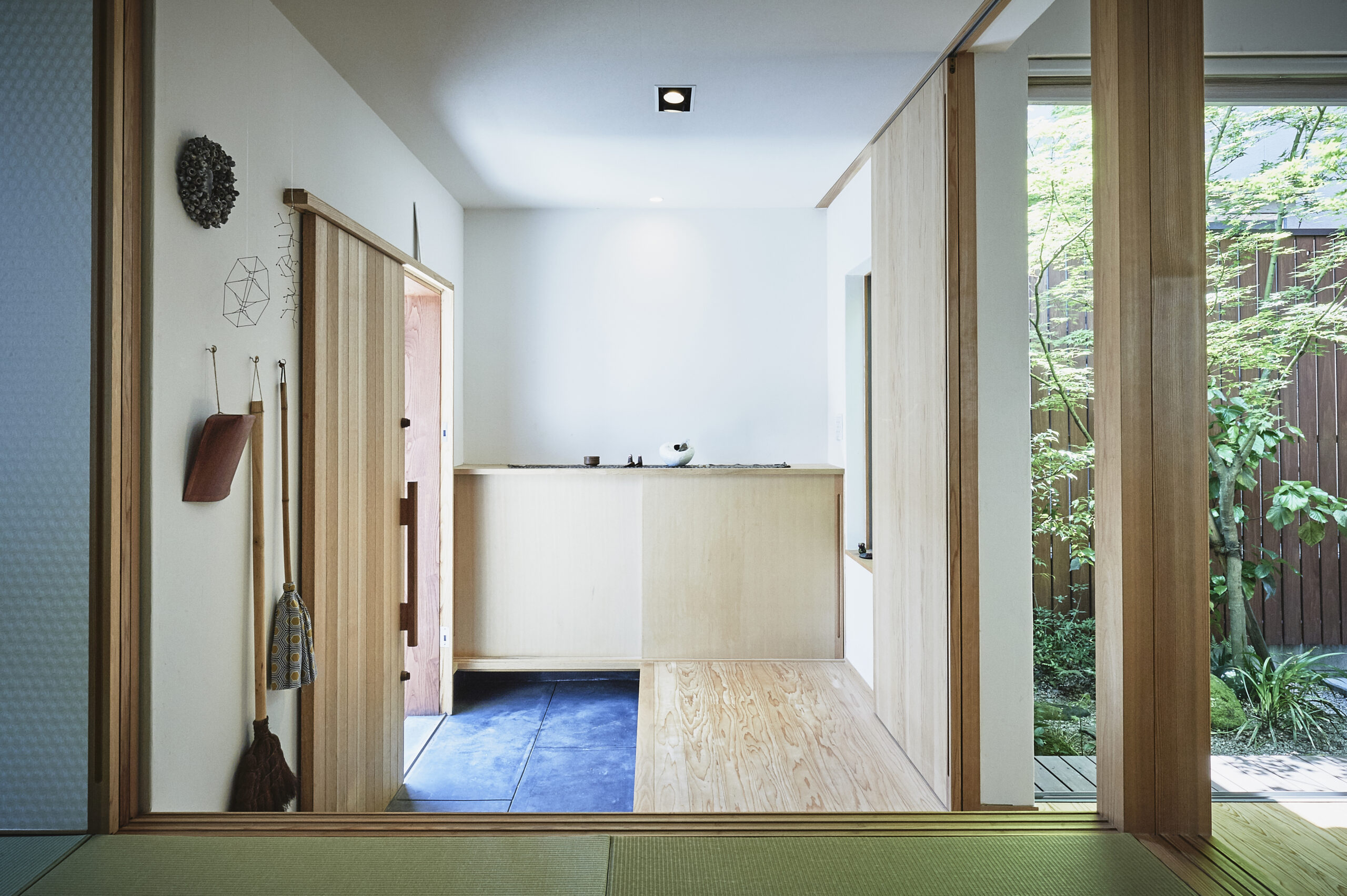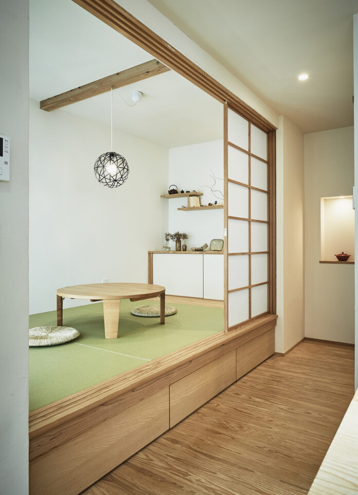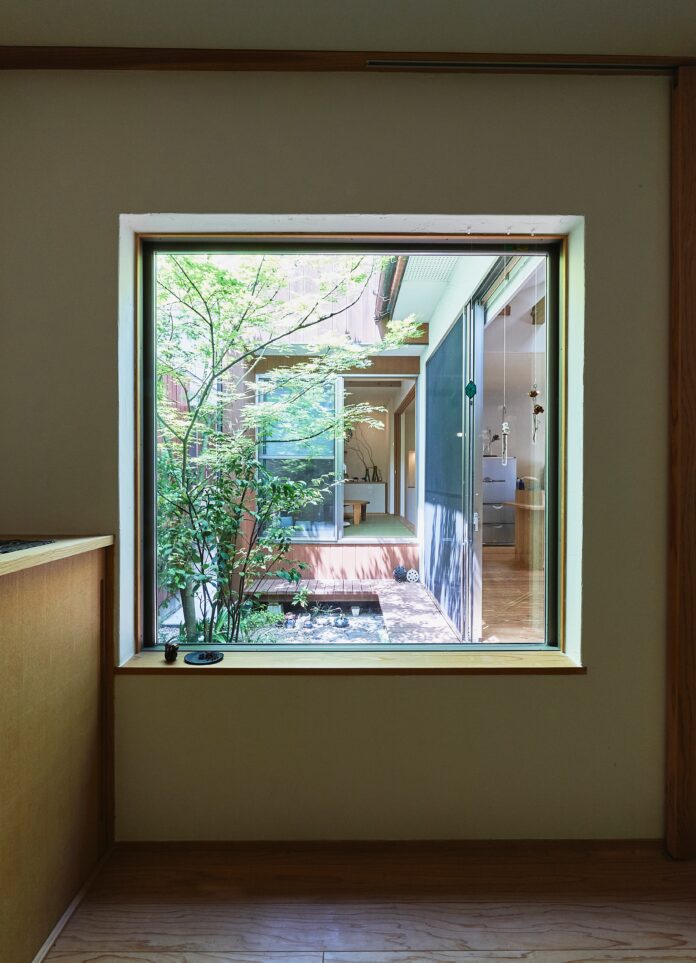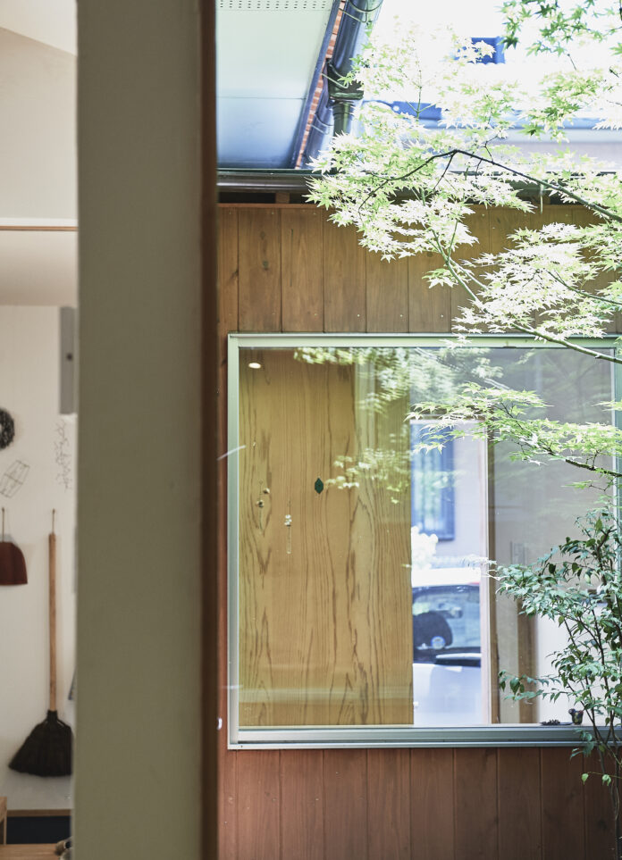 和室とリビングは坪庭を囲み、光と季節を映す。